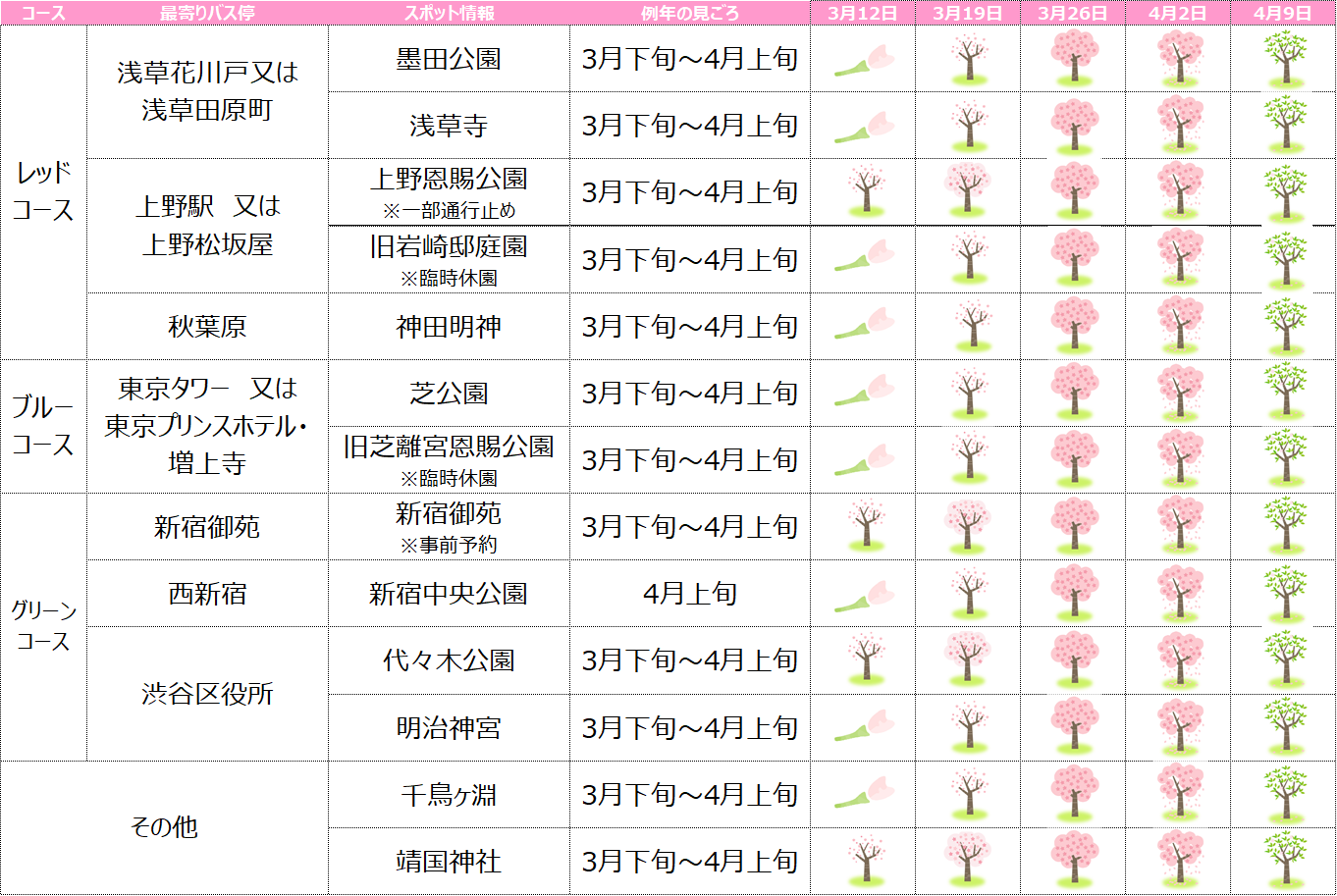 スカイホップバスのバス停に近い桜の開花情報を抜粋して、毎週末にご案内して参ります。
