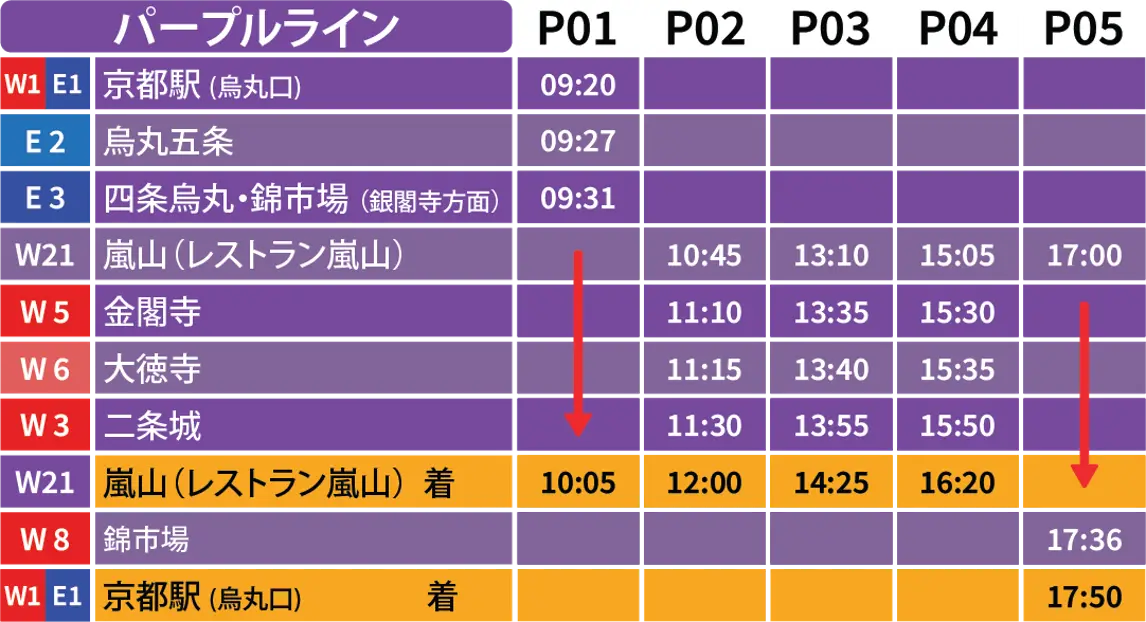 従来の西回り(レッドライン)・東回り(ブルーライン)に加えて、期間限定で嵐山へ向かうパープルラインを運行します。