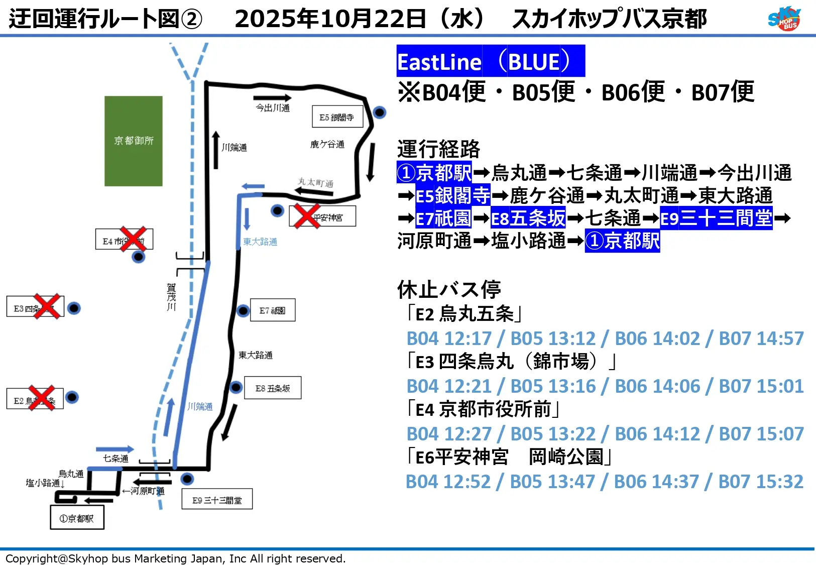 E3 Shijo Karasuma/Nishiki-Ichiba Market : from 12:21 (BLUE 04) to 15:01 (BLUE 07), total of 4 services