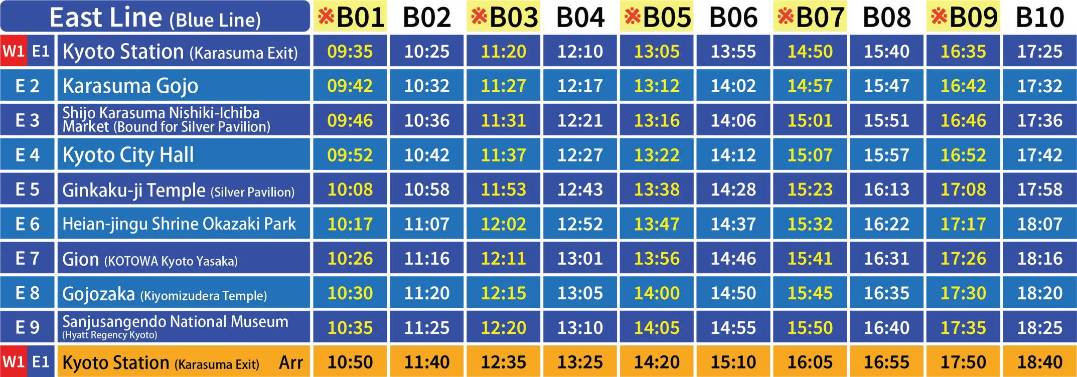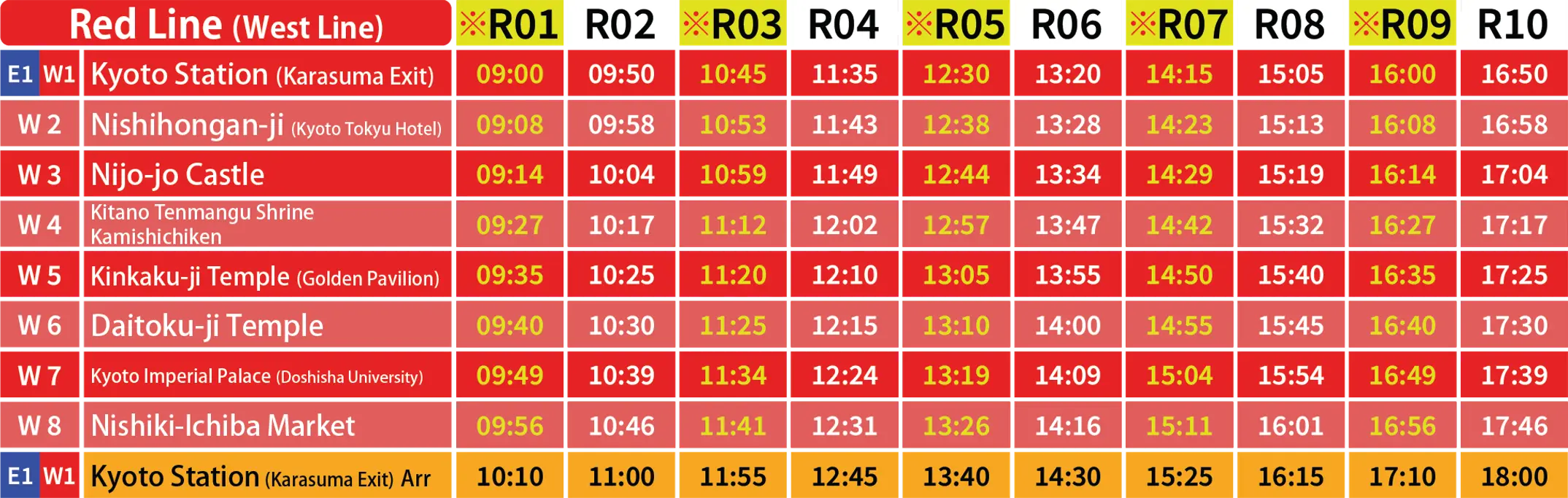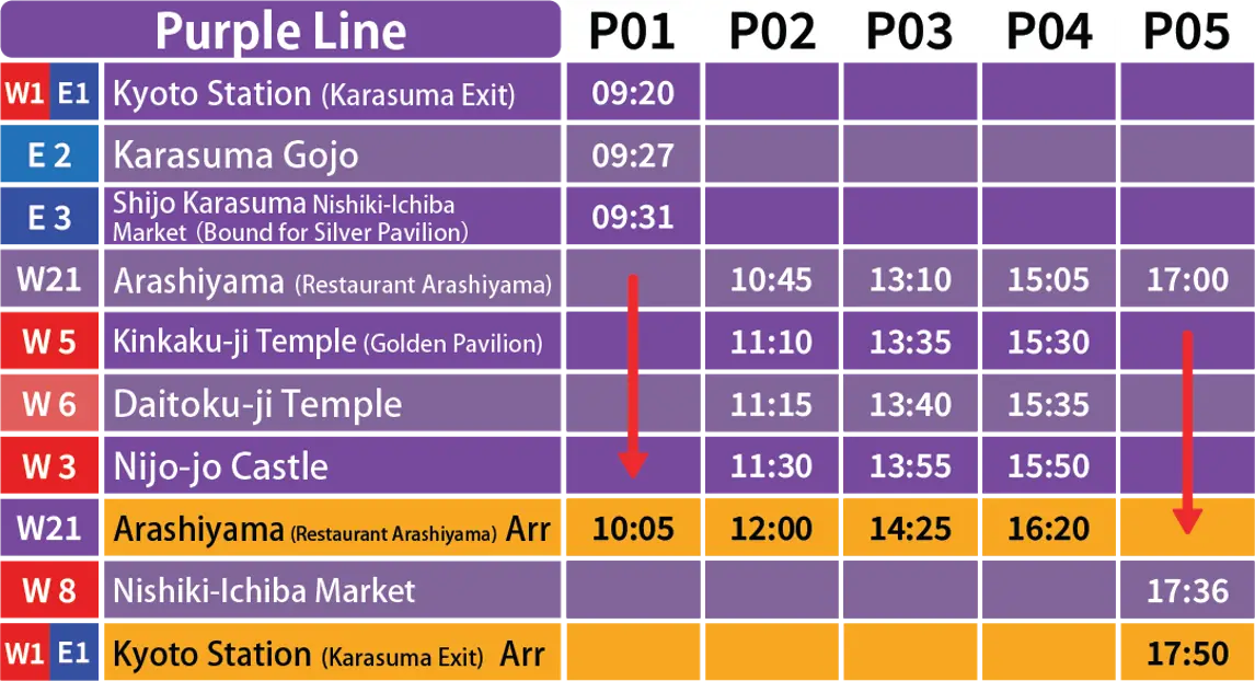 In addition to the regular West Line (Red Line) and East Line (Blue Line) routes, a limited-time Purple Line to Arashiyama will also be in operation.